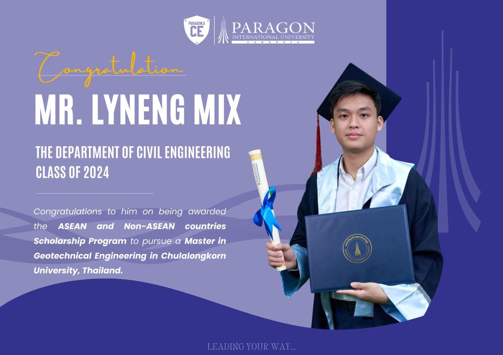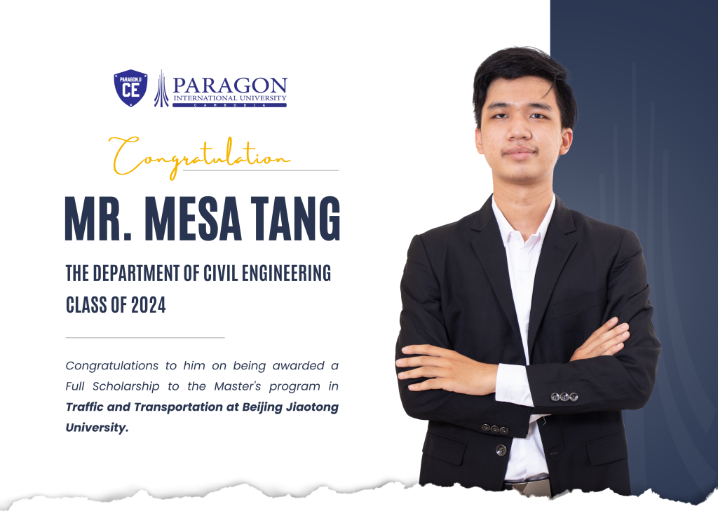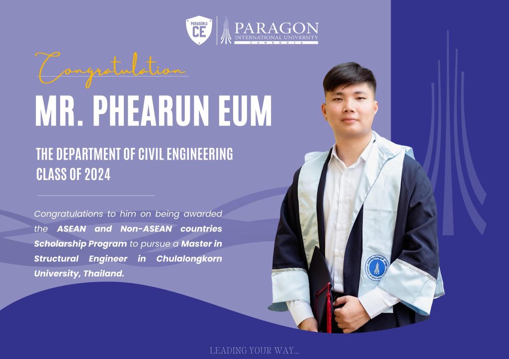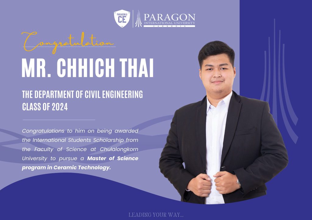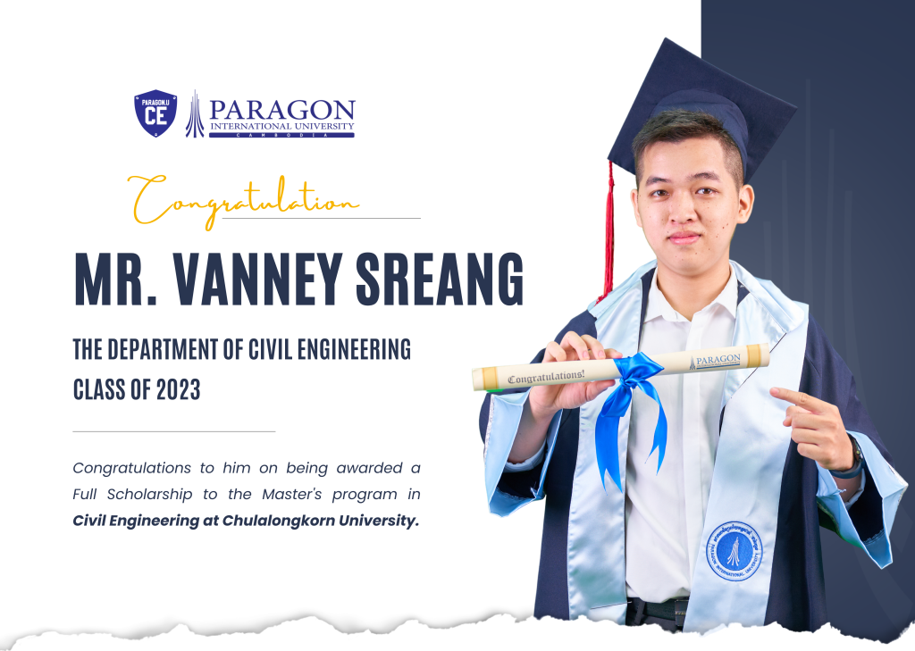 The Department of Civil Engineering at Paragon International University proudly congratulations to Mr. Vanney SREANG on being awarded a fully funded scholarship to the Master’s program in Civil Engineering at Chulalongkorn University.