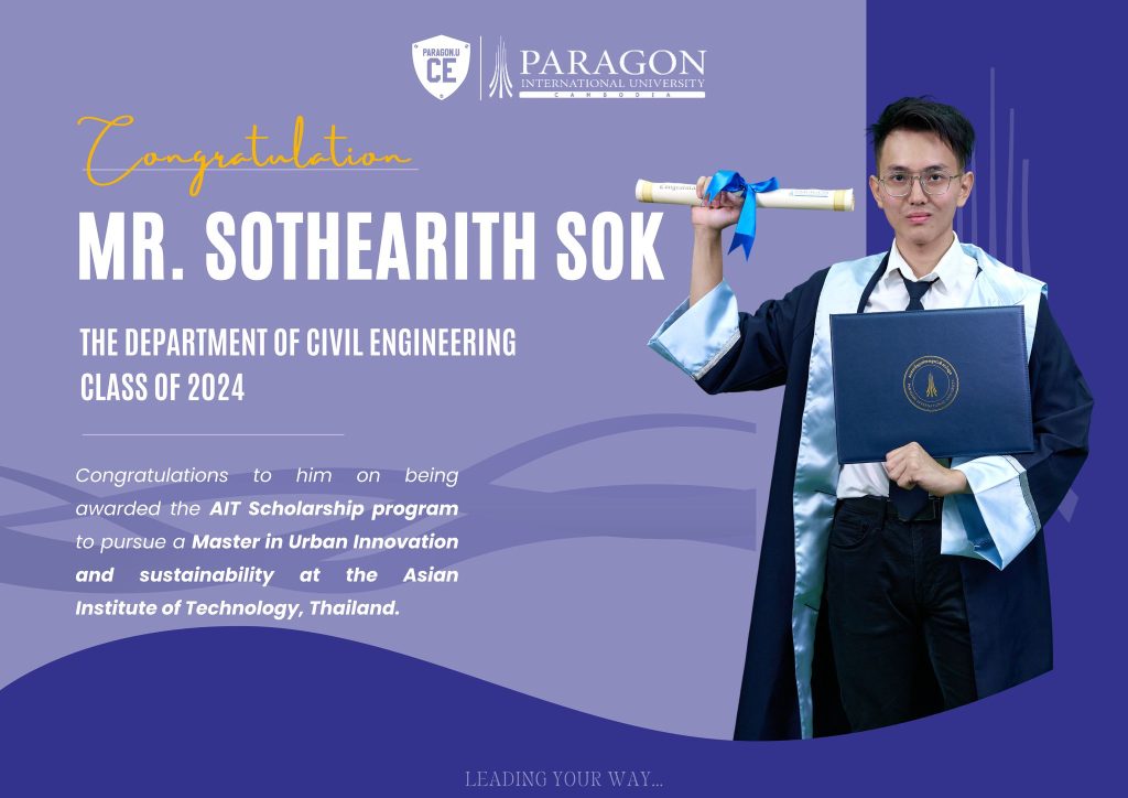 ๐ŸŽ‰ Huge congratulations to Mr. Sothearith Sok from the Department of Civil Engineering at Paragon International University! ๐ŸŽ“ He has been awarded the AIT Scholarship to pursue a Master’s in Urban Innovation and Sustainability at the Asian Institute of Technology (AIT) in January 2025. ๐ŸŒ๐ŸŒฑ