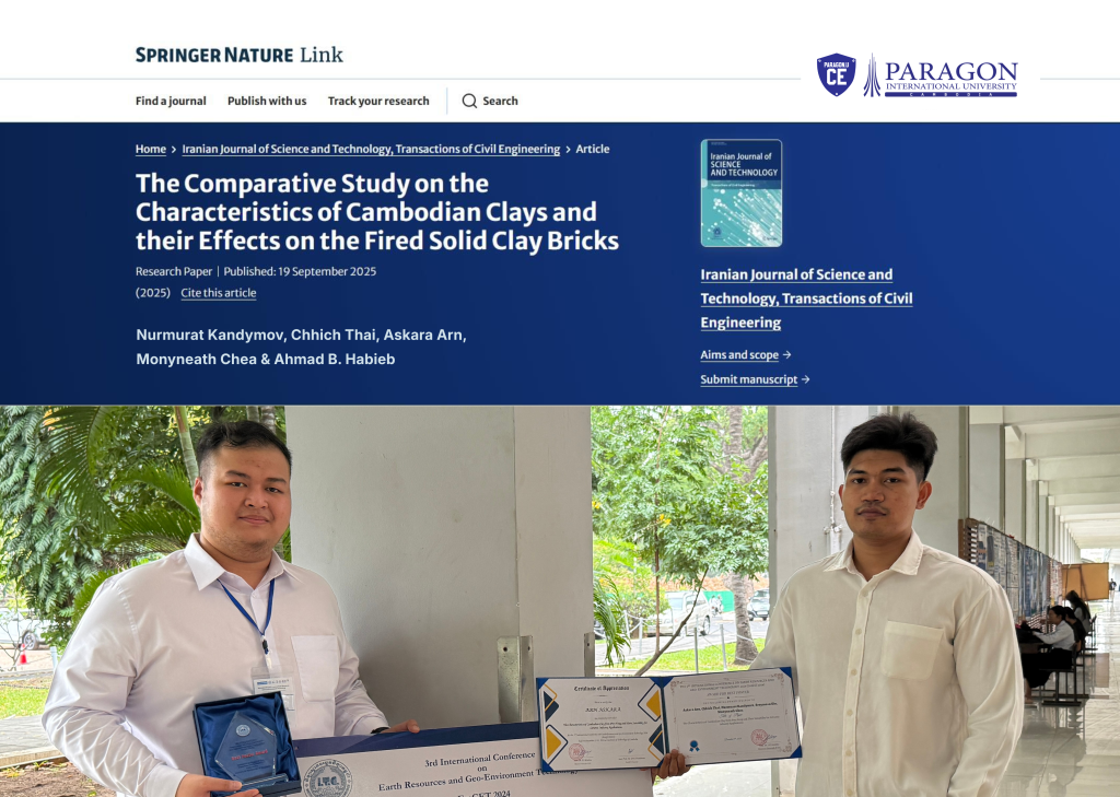 The Department of Civil Engineering at Paragon International University proudly celebrate the successful publication of the research paper titled โ€œThe Comparative Study on the Characteristics of Cambodian Clays and their Effects on the Field Solid Clay Bricksโ€ in a prestigious international journal.