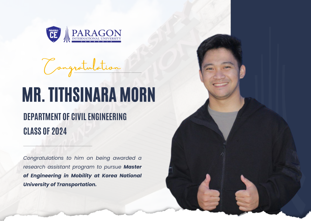 The Department of Civil Engineering at Paragon International University proudly congratulations to Mr. Tithsinara MORN on being awarded a prestigious research assistant program to pursue his Master of Engineering in Mobility at Korea National University of Transportation, South Korea.